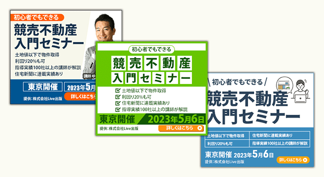 セミナーバナー広告 投稿日: 2025年7月6日2025年7月10日 投稿者: aiiro-design 競売不動産入門セミナーバナーデザイン 使用ツール : Photoshop イメージカラー : 青、緑、白 目的 競売不動産入門セミナーの告知 セミナー申し込みへの誘導 デザインの説明 競売不動産入門セミナーの訴求バナーを3種類制作。業界カラーであるグリーン系・ブルー系を意識した配色で、初心者の方でも安心して問い合わせてみたくなるような信頼感のあるバナーに仕上げました。
